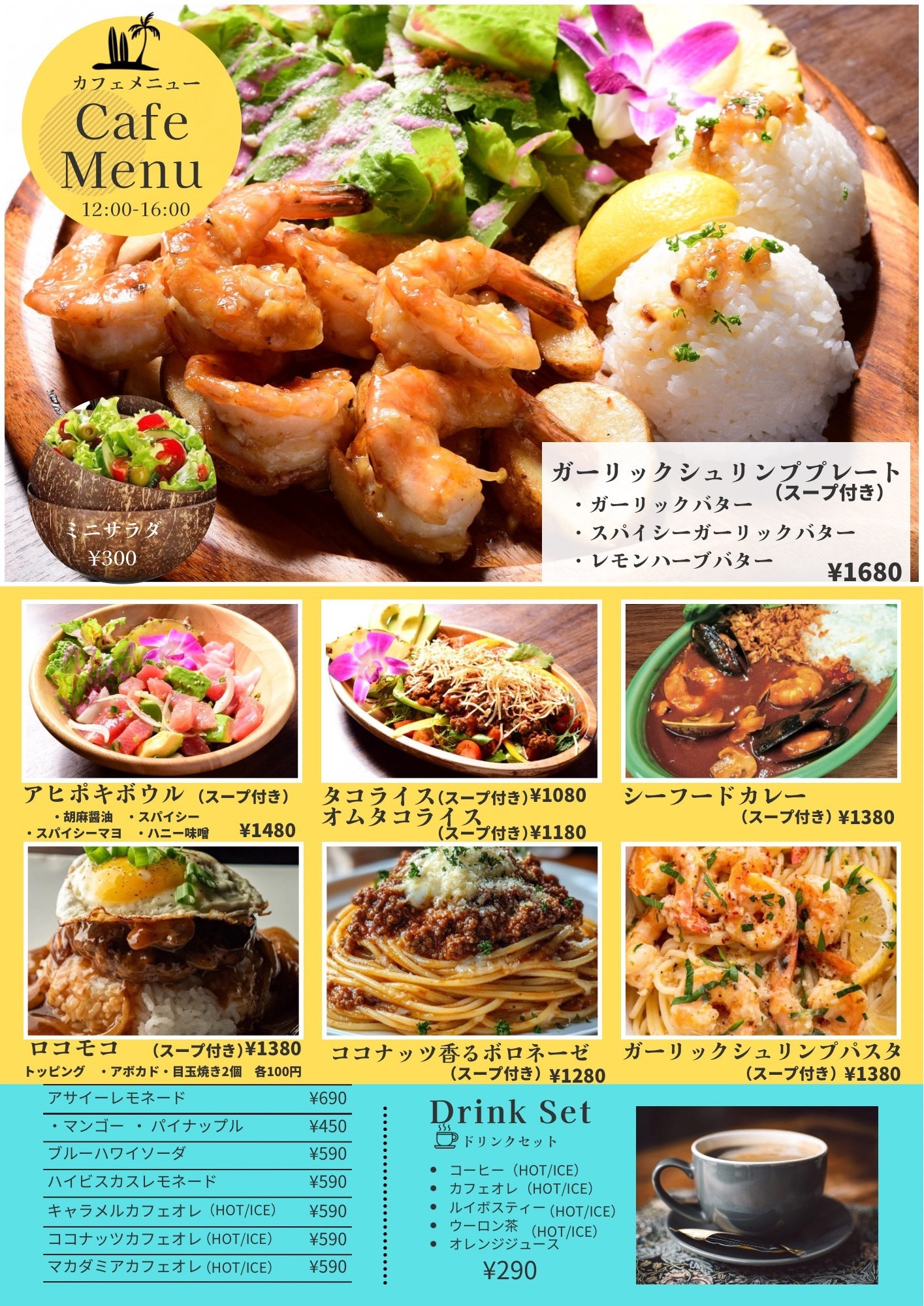 手づかみスタイルでワイワイと食べるシーフードプレートやガーリックシュリンプ、スペアリブ、ロブスター、アサイーボウル、スパムむすびなど、南国気分が味わえるお店です♪ 1番人気は大きなプリプリエビを使用したガーリックシュリンプです♪ ノンアルコールカクテルやノンアルコールワインなどもございますので、運転のお客様もお楽しみいただけます。
