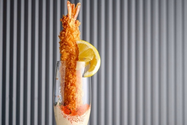 名物は、15cmサイズの新鮮なエビを使用した「特大場外エビフライ」(748円)。野球のバットをイメージし、タルタルソース入りのグラスにエビを立てて提供する盛り付けは、味はもちろん、見た目のインパクトも抜群だ。