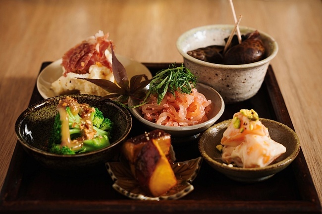 料理は鰹節や昆布だし、薄口しょうゆを軸にした和食がベース。旬の野菜や魚介類をふんだんに使いつつ、食材のかけ合わせなどでオリジナリティを生み出す。盛り付けは色合いや形のバランスを意識し、素材の魅力が引き立つよう工夫。器も料理に合う和食器を選び、季節感や素材感を引き立てているという。