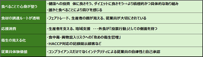 飲食店において、これまでも「健康」や「安全」は大切なテーマでした。しかしこれからは、もっとポジティブで内面的な充足感が求められます。おいしいものを食べて幸せを感じる、心地よい空間で癒やされる。そうした体験にお金を払うことが、自分を大切にすることにつながり、自己肯定感を高める。そんな消費行動が、これから重要な要素となっていくと予測しています。