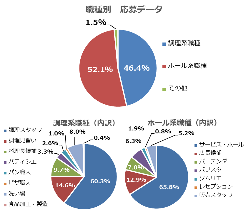 調理系職種では、調理スタッフの応募が前月比5.8%増、ホール系職種では、店長候補・マネージャーの応募が前月比1.7%増となりました。